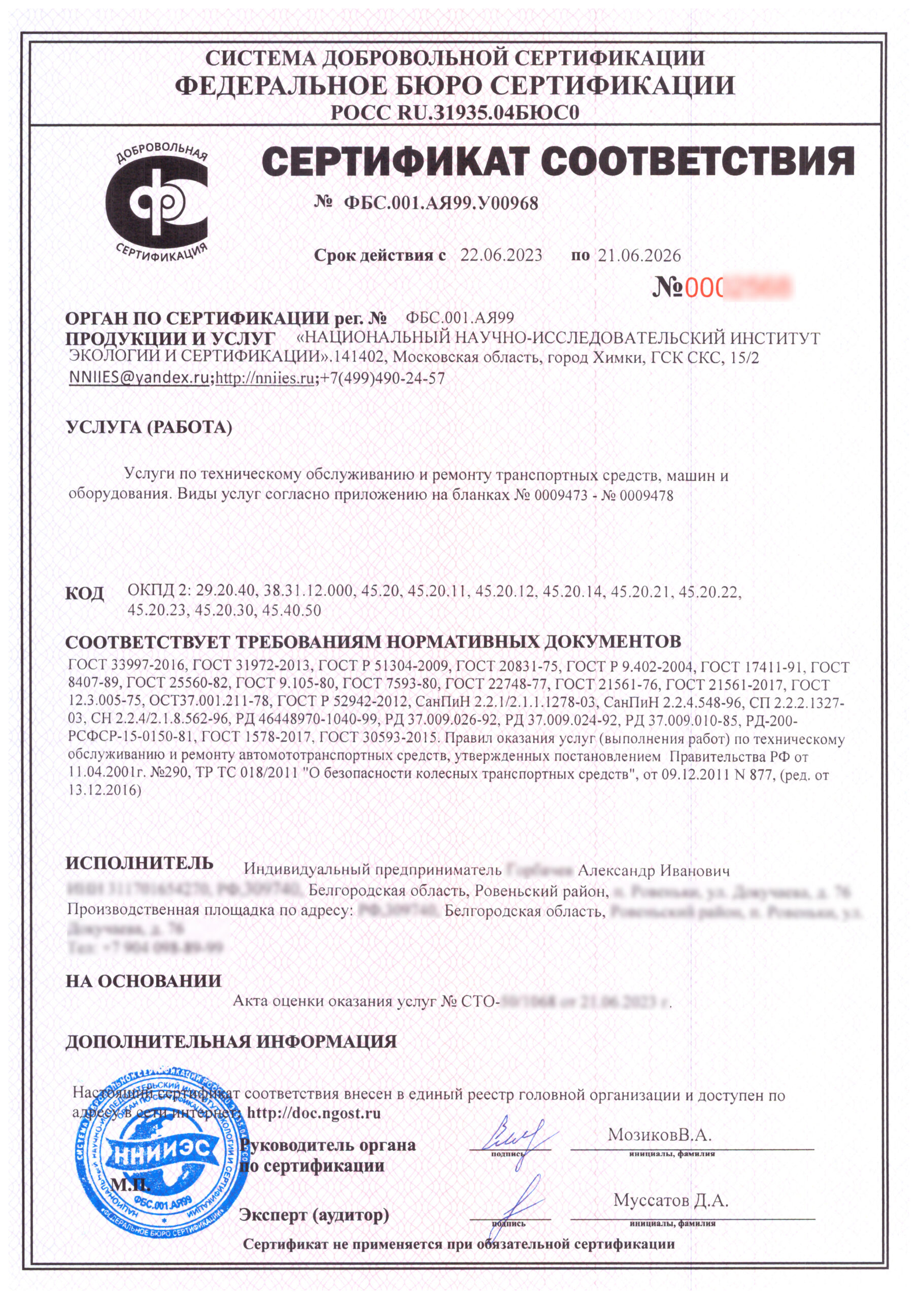 При оформлении у нас заявления-декларации на переоборудование, мы предоставляем все необходимые сертификаты на услуги и оборудование от сертифицированного СТО В ПОДАРОК!