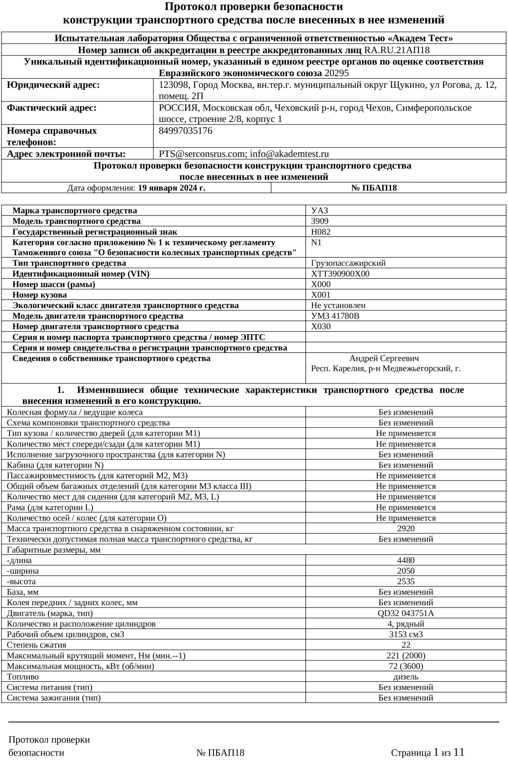Протокол проверки безопасности конструкции транспортного средства, образец